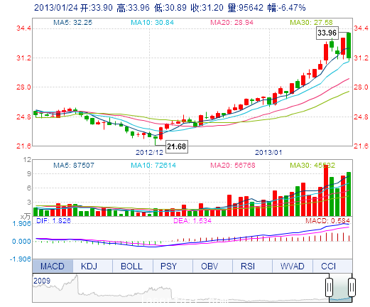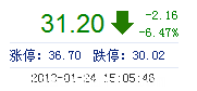 | 今 開: | 33.90 | 成交量: | 9.56萬(wan) 手 | 振 幅: | 9.20% |
