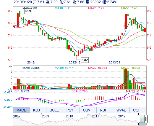 | 今 開: | 7.61 | 成交量: | 2.40萬(wan) 手 | 振 幅: | 3.78% |