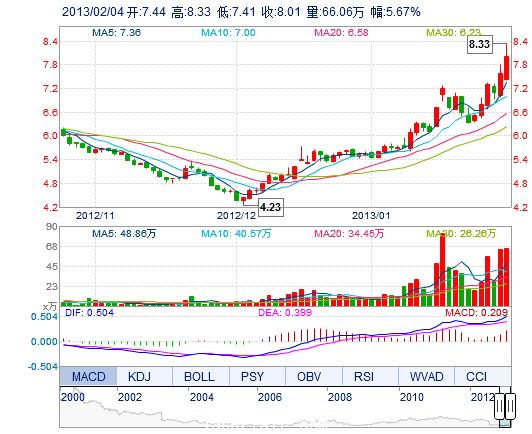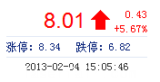 | 最 高: | 8.33 | 成交額: | 5.25億(yi) 元 | 換手率: | 7.41% |