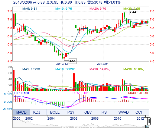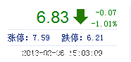 | 今 開: | 6.88 | 成交量: | 5.31萬(wan) 手 | 振 幅: | 2.17% |