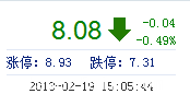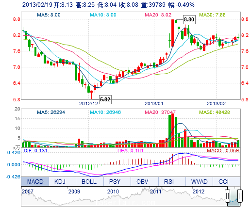 | 今 開: | 8.13 | 成交量: | 3.98萬(wan) 手 | 振 幅: | 2.59% |