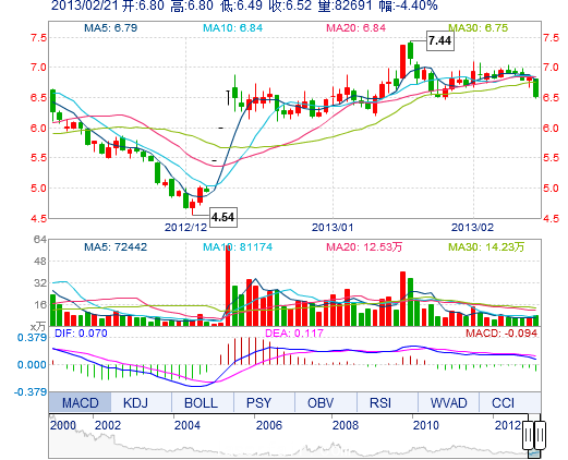 | 今 開: | 6.80 | 成交量: | 8.27萬(wan) 手 | 振 幅: | 4.55% |