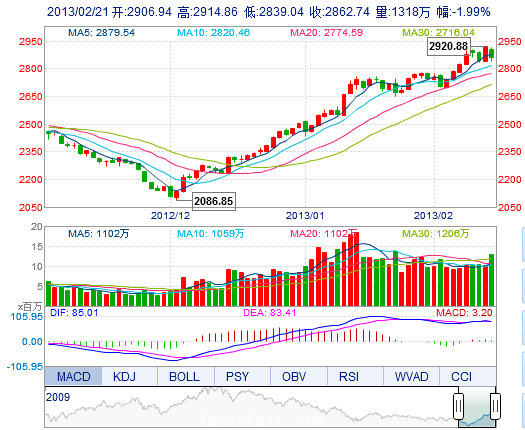 今開: 2906.94 最高: 2914.86 昨收: 2920.88 最低: 2839.04 成交量: 1317.99萬(wan) 手 振幅: 2.60% 成交額: 152.03億(yi) 元