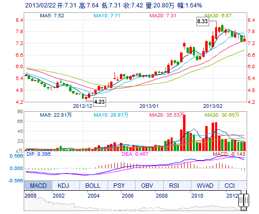 | 今 開: | 7.31 | 成交量: | 20.80萬(wan) 手 | 振 幅: | 4.52% |