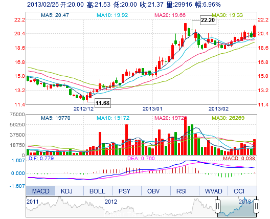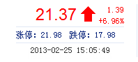 | 最 高: | 21.53 | 成交額: | 6235.72萬(wan) 元 | 換手率: | 8.94% |