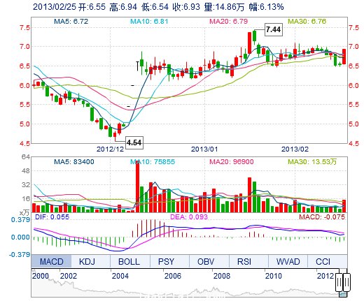 今開: 6.55 成交量: 14.86萬(wan) 手 振幅: 6.13% 最高: 6.94 成交額: 1.01億(yi) 元 換手率: 3.40% 最低: 6.54 總市值: 30.27億(yi) 市淨率: 2.25 昨收: 6.53 流通市值: 30...