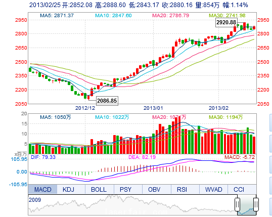 今開: 2852.08 最高: 2888.60 昨收: 2847.56 最低: 2843.17 成交量: 854.09萬(wan) 手 振幅: 1.60% 成交額: 101.72億(yi) 元