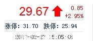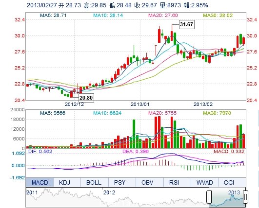 今開: 28.73 成交量: 8973手 振幅: 4.75% 最高: 29.85 成交額: 2614.35萬(wan) 元 換手率: 8.57% 最低: 28.48 總市值: 10.38億(yi) 市淨率: 3.62 昨收: 28.82 流通市值...