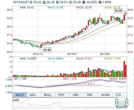 | 最 高: | 36.39 | 成交額: | 5.15億(yi) 元 | 換手率: | 5.27% |