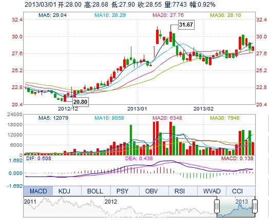 今開: 28.00 成交量: 7743手 振幅: 2.76% 最高: 28.68 成交額: 2199.79萬(wan) 元 換手率: 7.40% 最低: 27.90 總市值: 9.99億(yi) 市淨率: 3.48 昨收: 28.29 流通市值:...