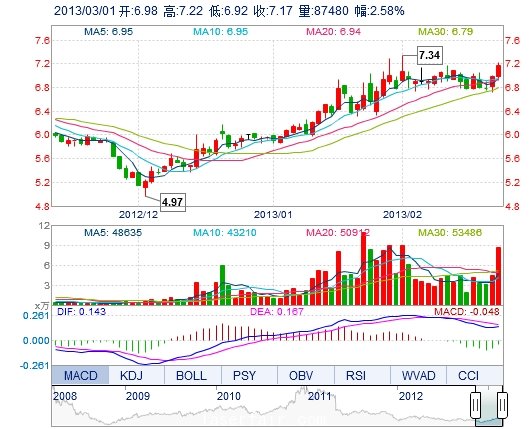 今開: 6.98 成交量: 8.75萬(wan) 手 振幅: 4.29% 最高: 7.22 成交額: 6197.04萬(wan) 元 換手率: 3.18% 最低: 6.92 總市值: 20.43億(yi) 市淨率: 3.33 昨收: 6.99 流通市值: ...