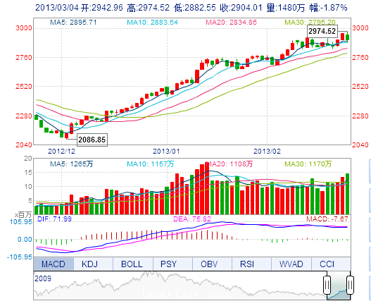 今 開: 2942.96 最 高: 2974.52 昨 收: 2959.24 最 低: 2882.55 成交量: 1479.52萬(wan) 手 振 幅: 3.11% 成交額: 159.14億(yi) 元