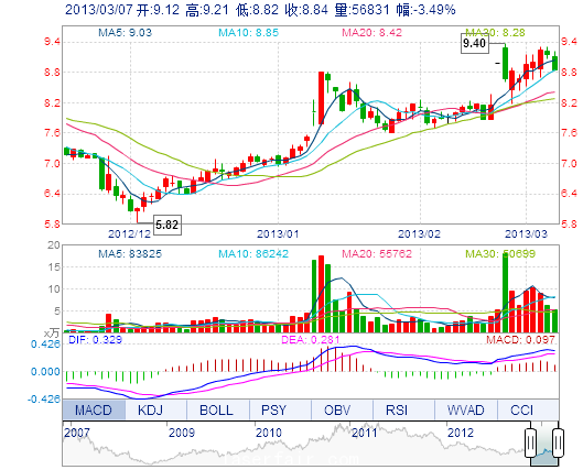 | 今 開: | 9.12 | 成交量: | 5.68萬(wan) 手 | 振 幅: | 4.26% |