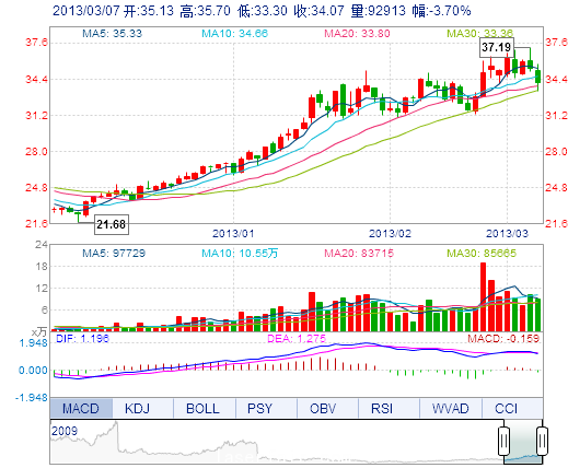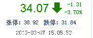 | 今 開: | 35.13 | 成交量: | 9.29萬(wan) 手 | 振 幅: | 6.78% |