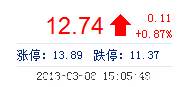 | 最 高: | 13.18 | 成交額: | 4.74億(yi) 元 | 換手率: | 3.89% |