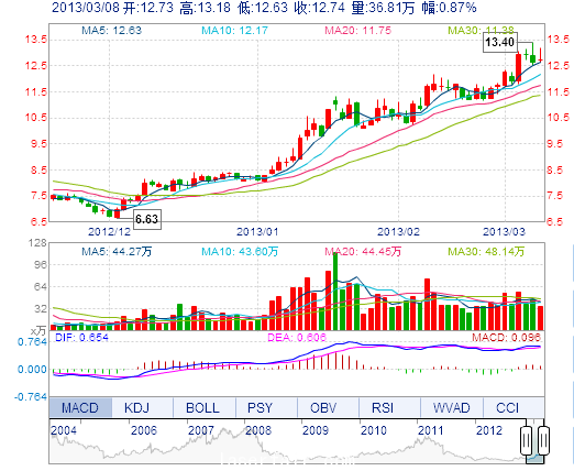 今 開: 12.73 成交量: 36.81萬(wan) 手 振 幅: 4.35% 最 高: 13.18 成交額: 4.74億(yi) 元 換手率: 3.89% 最 低: 12.63 總市值: 133.06億(yi) 市淨率: 4.11 昨 收: 12.63 流...