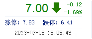 | 今 開: | 7.10 | 成交量: | 3.63萬(wan) 手 | 振 幅: | 3.65% |