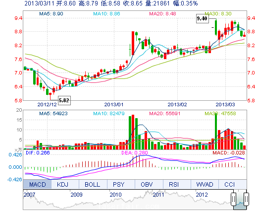 | 今 開: | 8.60 | 成交量: | 2.19萬(wan) 手 | 振 幅: | 2.44% |
