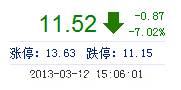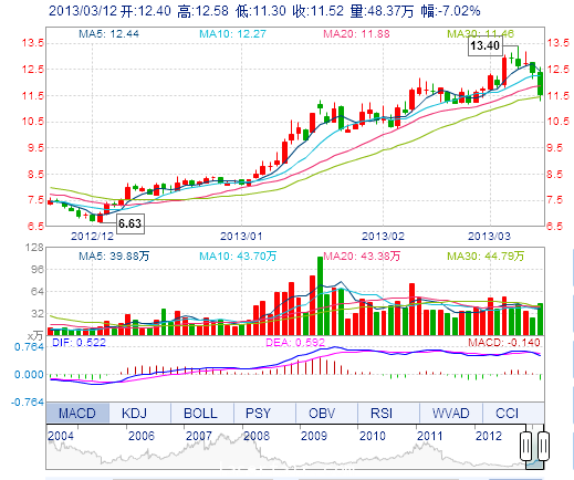 | 今 開: | 12.40 | 成交量: | 48.37萬(wan) 手 | 振 幅: | 10.33% |