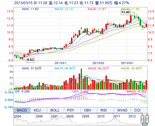 | 今 開: | 11.28 | 成交量: | 51.96萬(wan) 手 | 振 幅: | 8.10% |