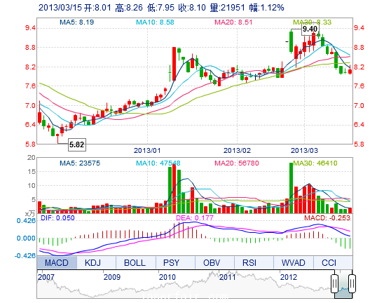 今 開: 8.01 成交量: 2.20萬(wan) 手 振 幅: 3.87% 最 高: 8.26 成交額: 1784.31萬(wan) 元 換手率: 1.13% 最 低: 7.95 總市值: 16.14億(yi) 市淨率: 3.25 昨 收: 8.01 流通市...