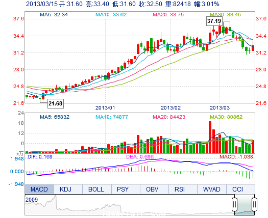 今 開: 31.60 成交量: 8.24萬(wan) 手 振 幅: 5.71% 最 高: 33.40 成交額: 2.70億(yi) 元 換手率: 2.99% 最 低: 31.60 總市值: 96.74億(yi) 市淨率: 7.42 昨 收: 31.55 流通...