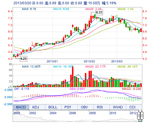 | 今 開: | 6.60 | 成交量: | 15.69萬(wan) 手 | 振 幅: | 4.43% |