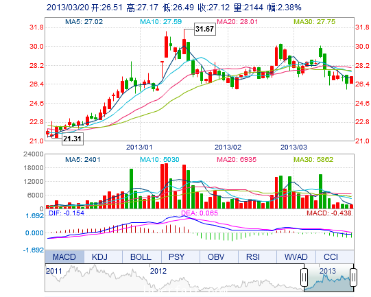 | 最 低: | 26.49 | 總市值: | 9.49億(yi) | 市淨率: | 3.36 |