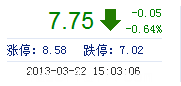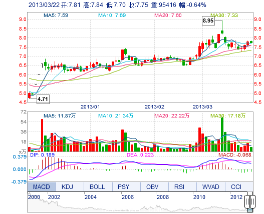 | 今 開: | 7.81 | 成交量: | 9.54萬(wan) 手 | 振 幅: | 1.79% |