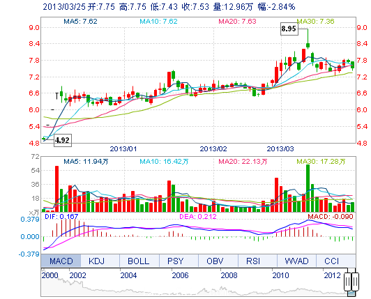| 今 開: | 7.75 | 成交量: | 12.96萬(wan) 手 | 振 幅: | 4.13% |