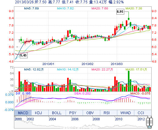 今開: 7.50 成交量: 13.42萬(wan) 手 振幅: 4.78% 最高: 7.77 成交額: 1.02億(yi) 元 換手率: 3.07% 最低: 7.41 總市值: 33.85億(yi) 市淨率: 2.51 昨收: 7.53 流通市值: 33...