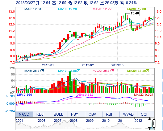 | 今 開: | 12.64 | 成交量: | 25.03萬(wan) 手 | 振 幅: | 3.72% |