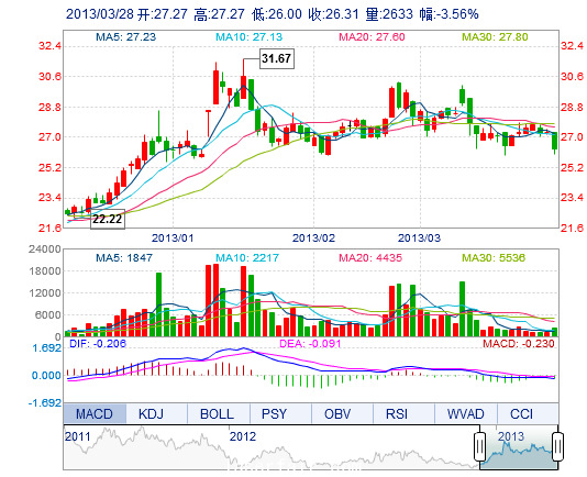 | 今 開: | 27.27 | 成交量: | 2633手 | 振 幅: | 4.66% |