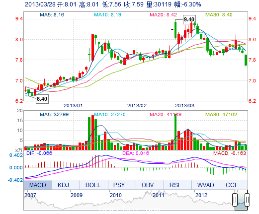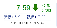 | 今 開: | 8.01 | 成交量: | 3.01萬(wan) 手 | 振 幅: | 5.56% |