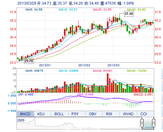 今 開: 34.73 成交量: 4.70萬(wan) 手 振 幅: 3.36% 最 高: 35.37 成交額: 1.64億(yi) 元 換手率: 1.71% 最 低: 34.20 總市值: 102.40億(yi) 市淨率: 7.85 昨 收: 34.78 流通...