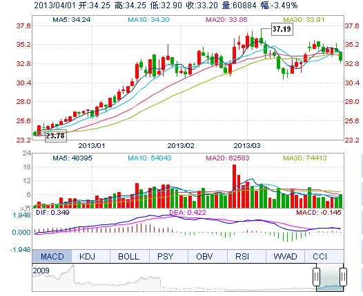 | 今 開: | 34.25 | 成交量: | 6.09萬(wan) 手 | 振 幅: | 3.92% |