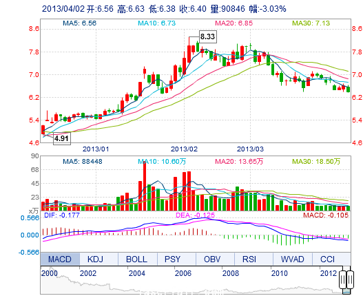 | 今 開: | 6.56 | 成交量: | 9.08萬(wan) 手 | 振 幅: | 3.79% |