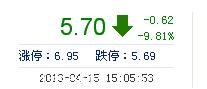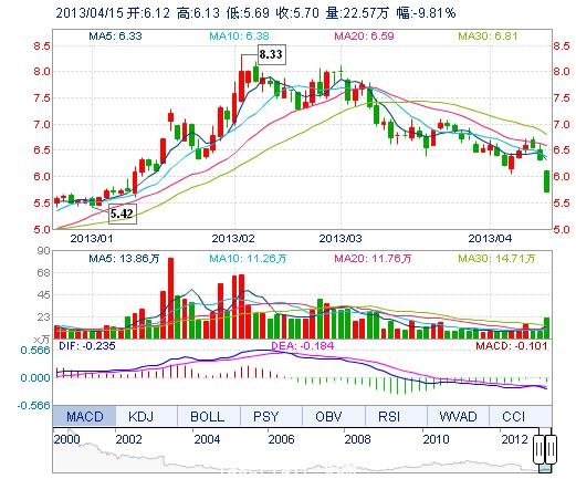 今開: 6.12 成交量: 22.57萬(wan) 手 振幅: 6.96% 最高: 6.13 成交額: 1.31億(yi) 元 換手率: 2.53% 最低: 5.69 總市值: 50.79億(yi) 市淨率: 1.94 昨收: 6.32 流通市值: 50...