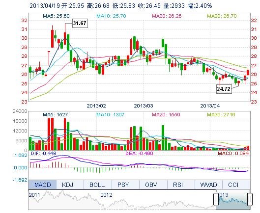 今開: 25.95 成交量: 2933手 振幅: 3.29% 最高: 26.68 成交額: 772.76萬(wan) 元 換手率: 2.80% 最低: 25.83 總市值: 9.26億(yi) 市淨率: 3.28 昨收: 25.83 流通市值: ...
