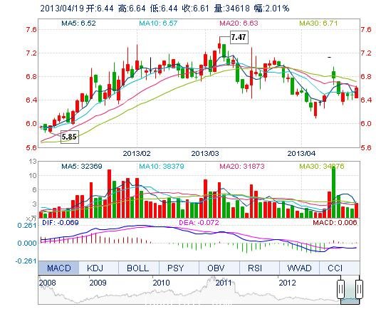 | 今 開: | 6.44 | 成交量: | 3.46萬手 | 振 幅: | 3.09% |