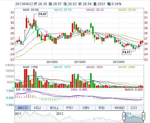 今開: 26.30 成交量: 2031手 振幅: 2.08% 最高: 26.57 成交額: 535.33萬(wan) 元 換手率: 1.94% 最低: 26.02 總市值: 9.29億(yi) 市淨率: 3.29 昨收: 26.45 流通市值: ...