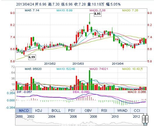 今開: 6.96 成交量: 10.19萬(wan) 手 振幅: 4.91% 最高: 7.30 成交額: 7346.53萬(wan) 元 換手率: 2.33% 最低: 6.96 總市值: 31.80億(yi) 市淨率: 2.36 昨收: 6.93 流通市值:...