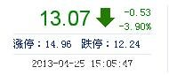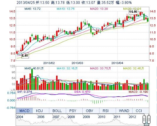 今開: 13.50 成交量: 35.52萬(wan) 手 振幅: 5.74% 最高: 13.78 成交額: 4.76億(yi) 元 換手率: 3.76% 最低: 13.00 總市值: 136.50億(yi) 市淨率: 4.04 昨收: 13.60 流通市值...