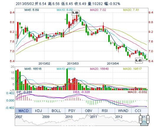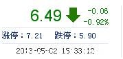 | 今 開: | 6.54 | 成交量: | 1.03萬手 | 振 幅: | 1.68% |