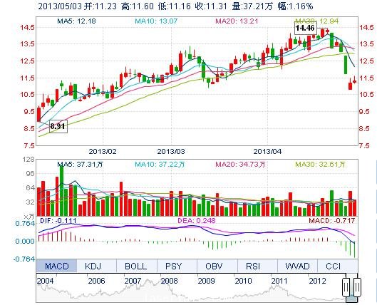 今開: 11.23 成交量: 37.21萬(wan) 手 振幅: 3.94% 最高: 11.60 成交額: 4.24億(yi) 元 換手率: 3.94% 最低: 11.16 總市值: 118.12億(yi) 市淨率: 3.41 昨收: 11.18 流通市值...
