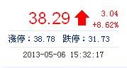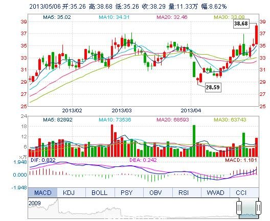 今開: 35.26 成交量: 11.33萬(wan) 手 振幅: 9.70% 最高: 38.68 成交額: 4.26億(yi) 元 換手率: 3.95% 最低: 35.26 總市值: 113.97億(yi) 市淨率: 7.97 昨收: 35.25 流通市值...
