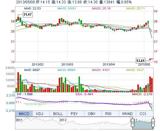 | 今 開: | 14.15 | 成交量: | 1.38萬手 | 振 幅: | 3.17% |