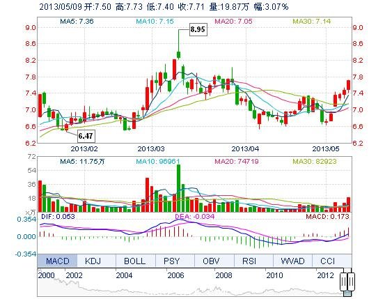 今開: 7.50 成交量: 19.87萬(wan) 手 振幅: 4.41% 最高: 7.73 成交額: 1.51億(yi) 元 換手率: 4.55% 最低: 7.40 總市值: 33.68億(yi) 市淨率: 2.40 昨收: 7.48 流通市值: 33...