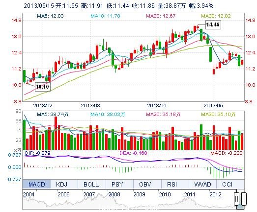 今開: 11.55 成交量: 38.87萬(wan) 手 振幅: 4.12% 最高: 11.91 成交額: 4.55億(yi) 元 換手率: 4.11% 最低: 11.44 總市值: 123.87億(yi) 市淨率: 3.57 昨收: 11.41 流通市值...