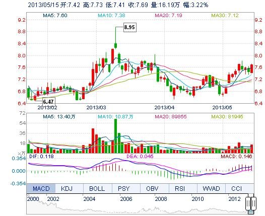 今開: 7.42 成交量: 16.19萬(wan) 手 振幅: 4.30% 最高: 7.73 成交額: 1.24億(yi) 元 換手率: 3.71% 最低: 7.41 總市值: 33.59億(yi) 市淨率: 2.40 昨收: 7.45 流通市值: 33...